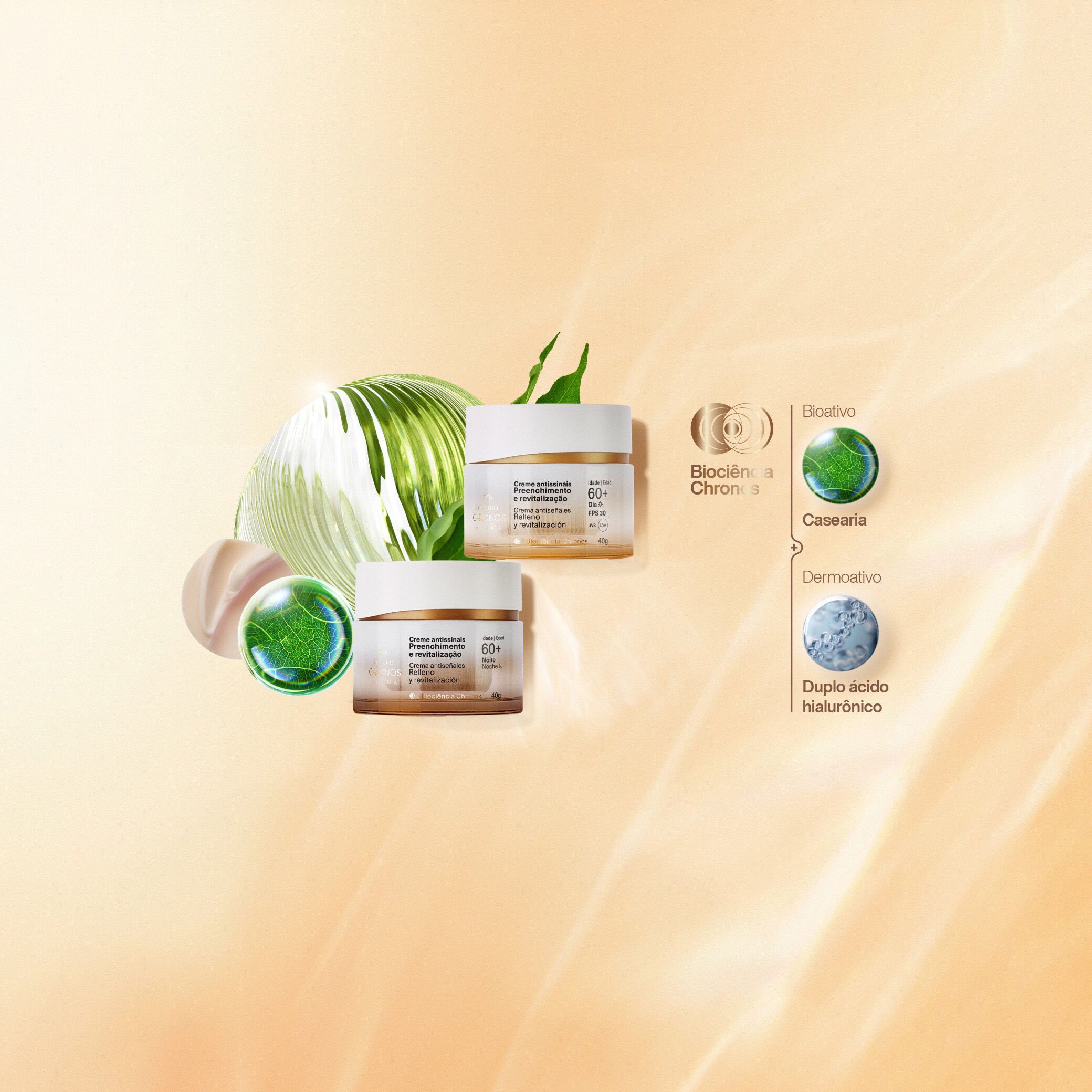 unión de potentes bioactivos de la naturaleza y dermoactivos para cuidar tu piel. el bioactivo Candeia estimula el ácido hialurónico natural de la piel. por su parte, el dermoactivo Doble ácido hialurónico rellena la superficie y las capas profundas de la piel