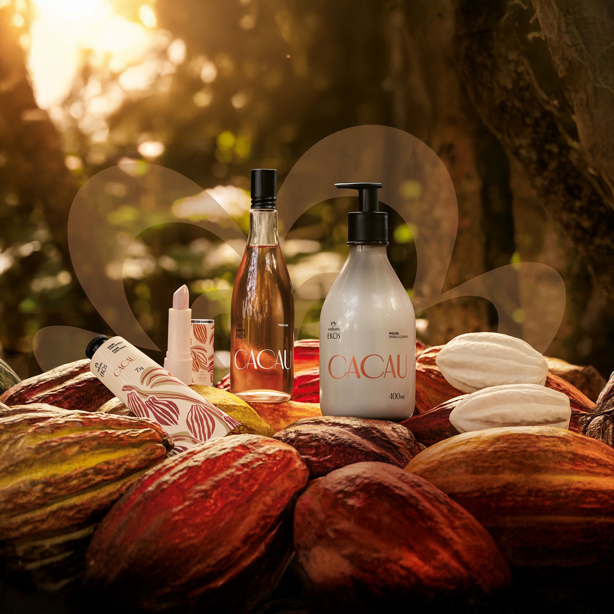fórmulas con alto poder de hidratación y una fragancia única que combina cremosidad y frescura. productos que cuidan tu cuerpo y generan ingresos para 150 familias guardianas del bosque. la línea Ekos Cacao se produce con la cosecha de almendras que adquirimos de la cooperativa CEPOTX, en Pará - Brasil