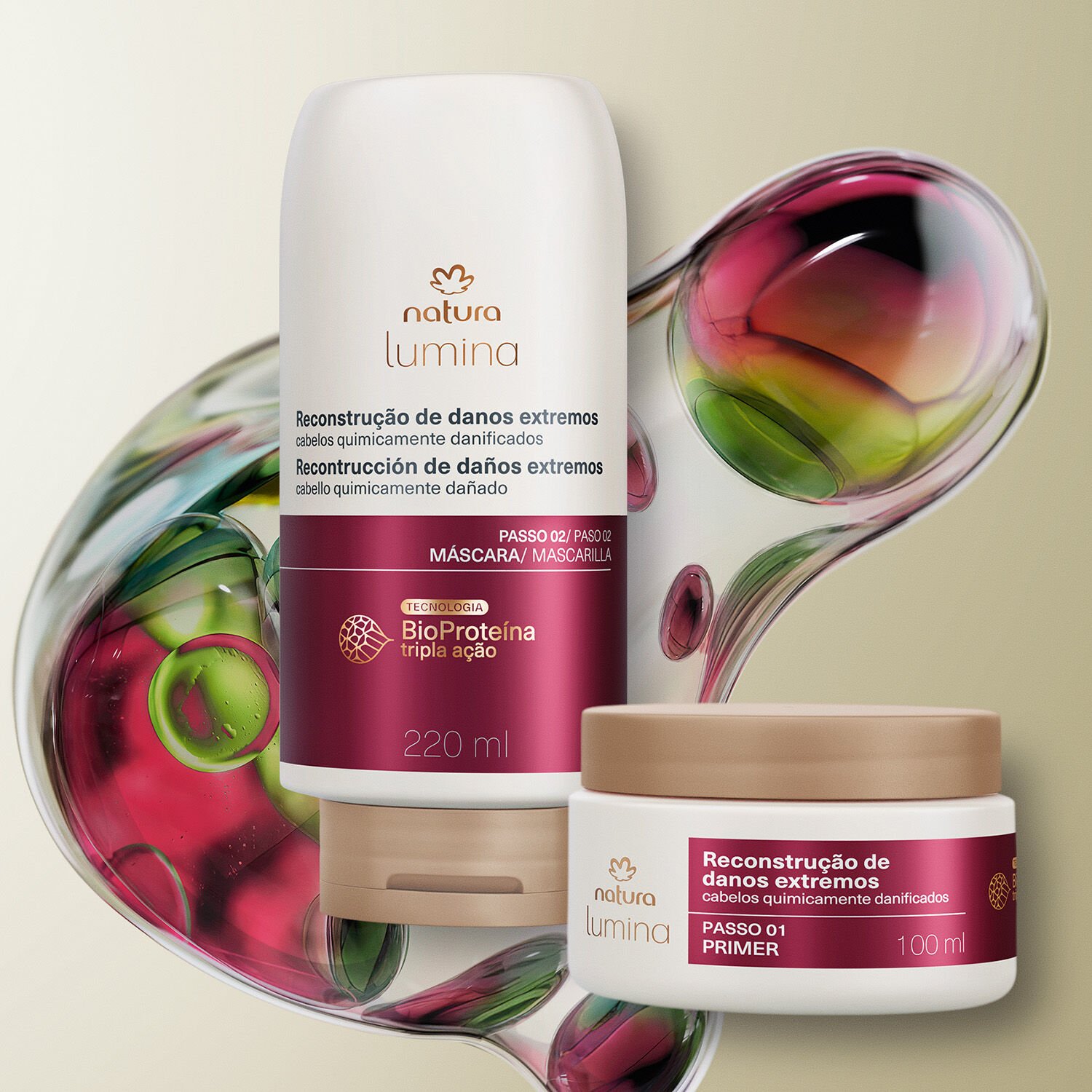 BioProteína Triple Acción + Activo Reestructurante: combinación exclusiva de activos que actúan en el relleno inteligente de los daños internos y en la reparación externa de la fibra capilar. promueven la reposición de lípidos y la reestructuración de las cutículas del cabello